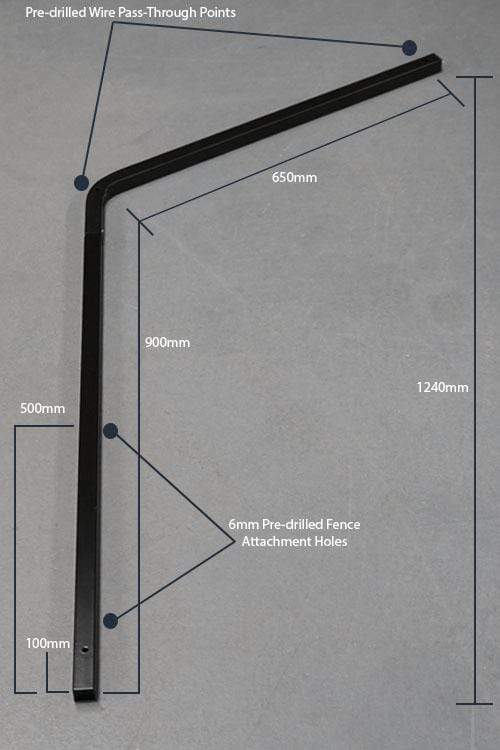 The bracket attaches to your existing fence post using two 6mm pre-drilled fence attachment holes — simply secure it with screws. It also features pre-drilled wire pass-through points along the angled arm to thread your wireline through, keeping the netting taut and secure.
