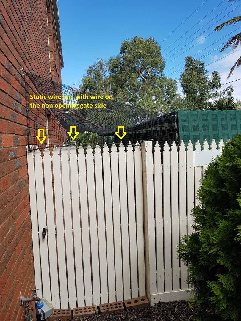 - The wireline at the top of the gate must be a static wireline, with an eyelet fixed at the start and end of the run — typically mounted on the gate post.